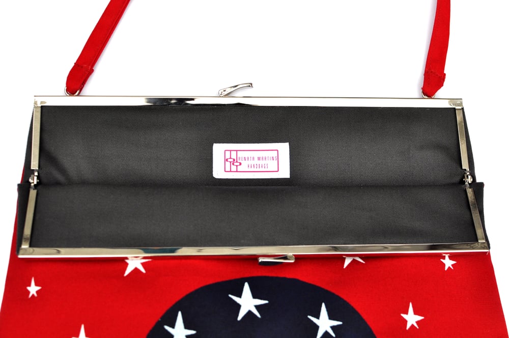 This fabric is hand silk screened in San Francisco by Renata Martins Bags.